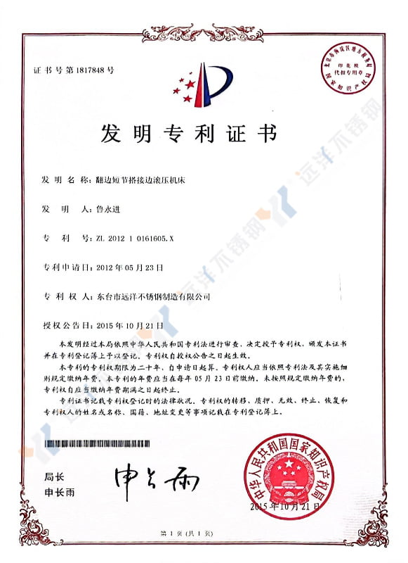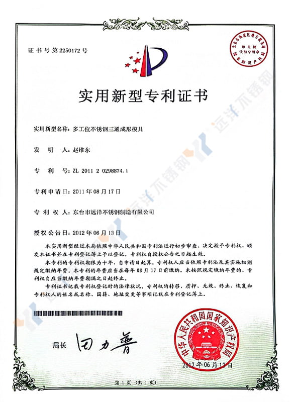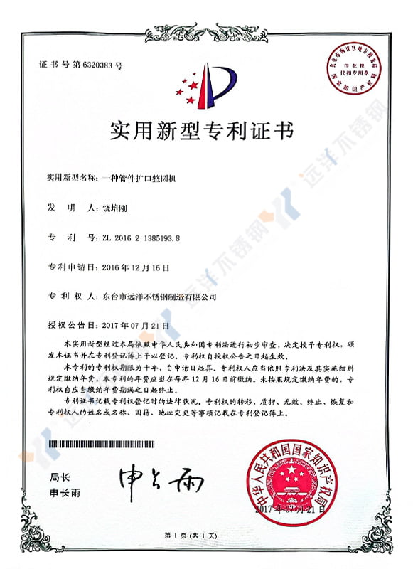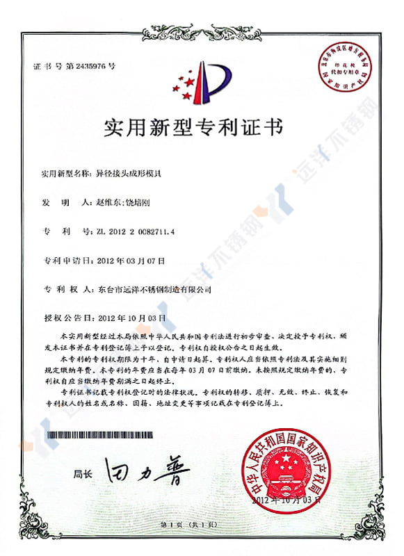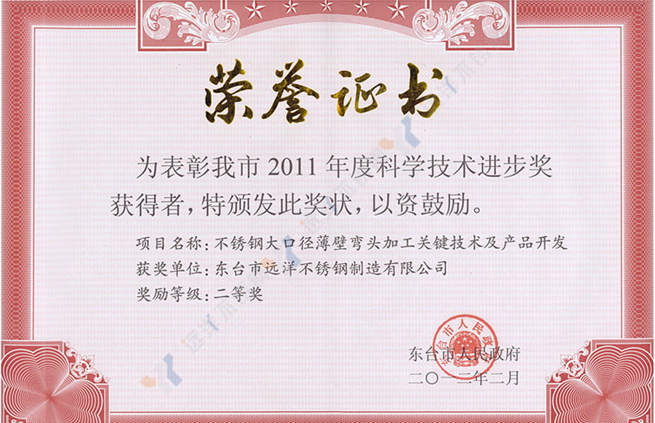 科技进步奖(不锈钢大口径薄壁弯头加工关键技术及产品开发)
